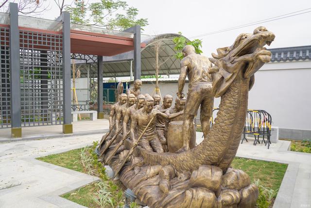 建在河涌边的龙舟文化主题公园,紧靠新溪龙船训练基地,园内一组活灵活现的扒龙船铜雕,将龙舟竞渡的情形生动地展现了出来。