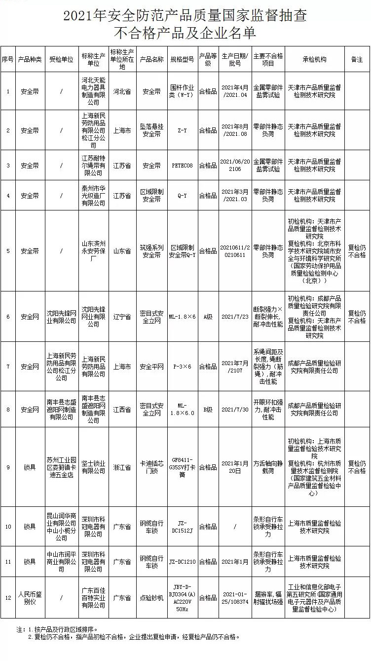 人民网北京12月13日电 (记者李楠桦)据市场监管总局消息,近期,市场监管总局组织开展了安全防范产品质量国家监督抽查。本次抽查了228家企业生产的238批次产品,涉及安全带、安全网、锁具、人民币鉴别仪等4种安全防范产品,抽查结果显示,共有12批次产品不合格。本次跟踪抽查到上次不合格企业8家,有1家企业本次抽查仍不合格,7家企业合格。
