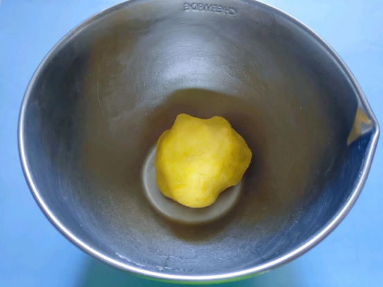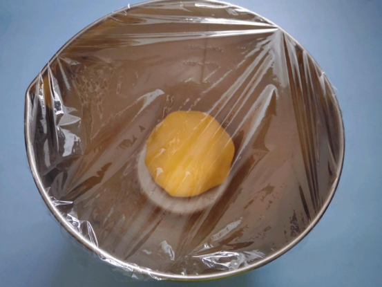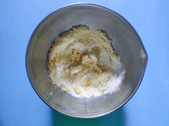 2、将准备好的面粉类全部过筛后依次倒入黄油内,先搅拌,在用手揉捏成面团。揉捏的时候保证盆内无干粉,面团的表面是光滑无颗粒感的即可。找个保鲜膜将盆口封住,放入冰箱冷藏1到1个半小时左右。这样做是为了让面团更好的粘合。