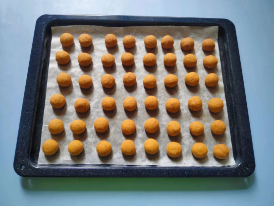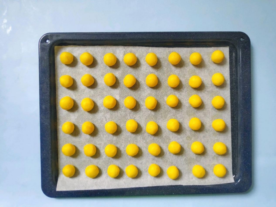 3、将烤箱180度预热5分钟,将静置好的面团拿出搓成长条形,在揪成10g1个的小团团,均匀的揉搓每个小团团成为一个标准的圆球装。拿出烤盘铺上油纸,将小团团依次放在烤盘上,中间留有2厘米的距离即可。