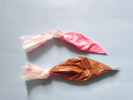 4、烤箱热后,将烤盘放入烤箱内烤制20分钟,看到小团团变成焦黄色就算好了。这时将巧克力隔水加热。因为巧乐力也不可以用直火加热,所以巧克力隔水加热的温度和黄油是一样的。加热后的巧克力分别放入两个裱花袋中。